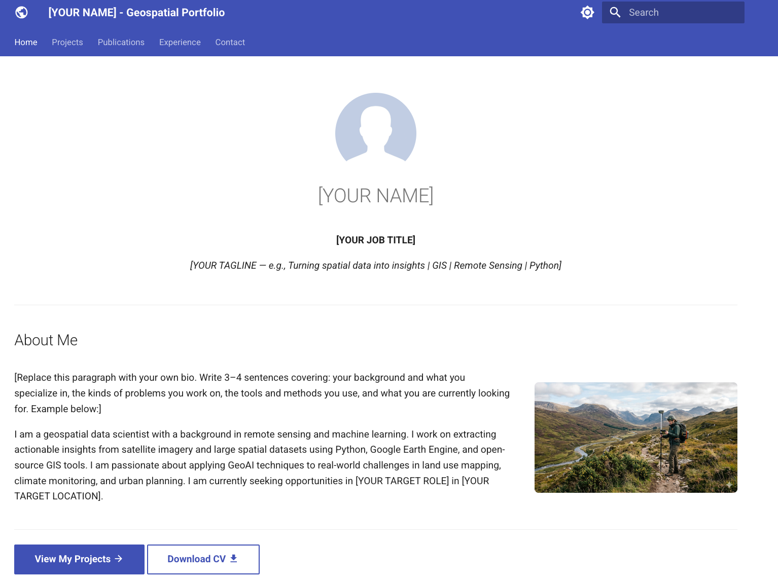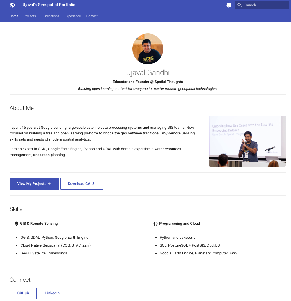 This workshop is designed to help you create and publish a modern portfolio website. We will start with a ready-to-use portfolio website template for geospatial professionals and learn how to edit and setup your GitHub repository to publish your website. At the end of the workshop, you will have a beautiful and customized website with your portfolio that is hosted for free on GitHub Pages and ready to be shared with your network.