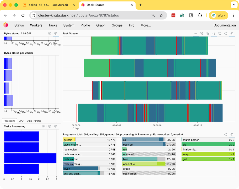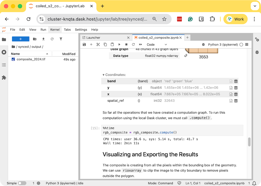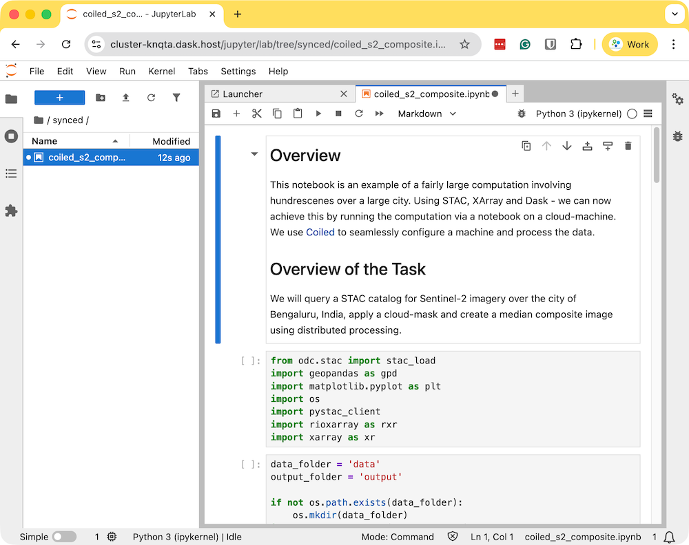 time_series_interpolated.coords['time'] = timestampsCoiled is a platform that allows you to easily setup cloud infrastructure for distributed processing. It provides a Python-package and a Notebook service that makes it very easy to scale your Xarray + Dask workflows to process large volumes of data. In this section, you will learn how to setup coiled and run a notebook in a cloud-hosted machine for creating a median cloud-free annual composite from Sentinel-2 imagery.