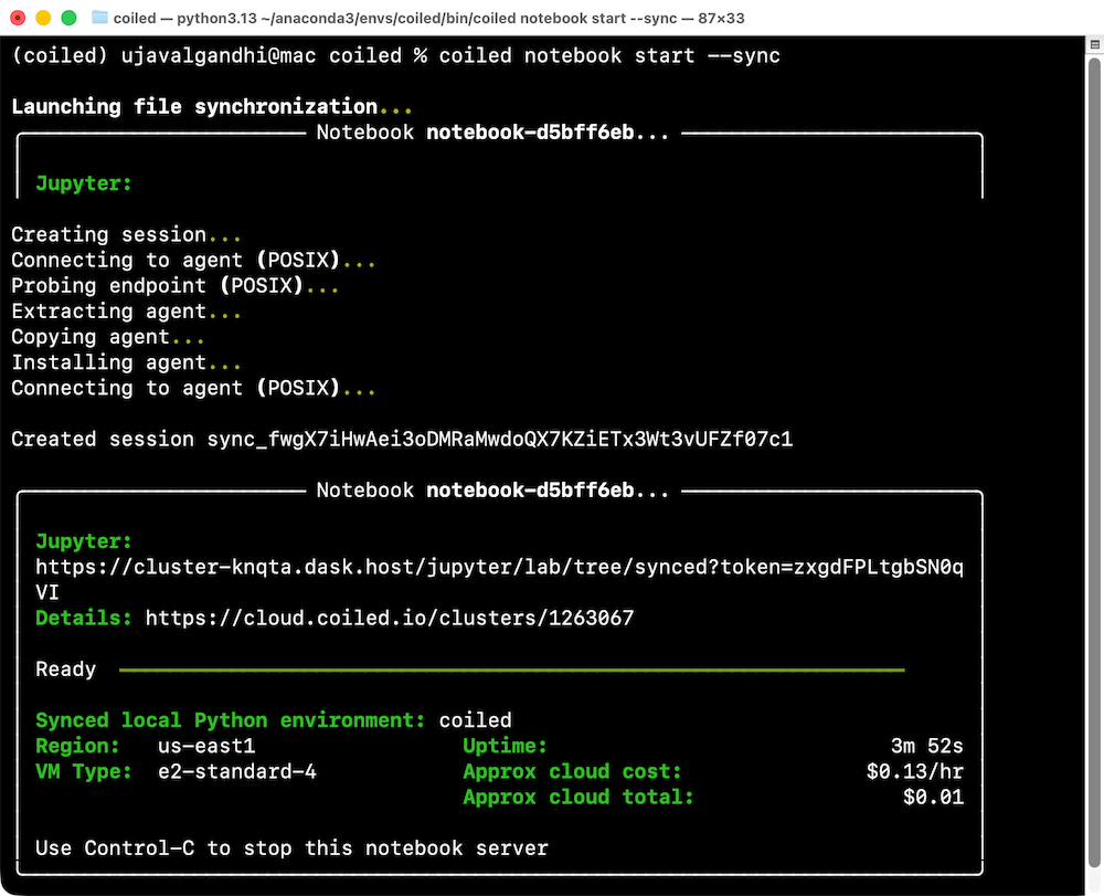 A great feature of the coiled notebook service is the ability to sync your local Python environment and files with the cloud machine. This requires installing the Mutagen utility. On MacOS and Linux, this is straightforward using Homebrew.