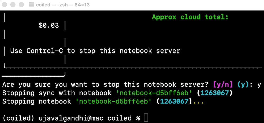 If you forget to stop the server, you will continue getting charged for the running intance in the cloud. You can always visit the Coiled Dashboard to verify that there are no running clusters.