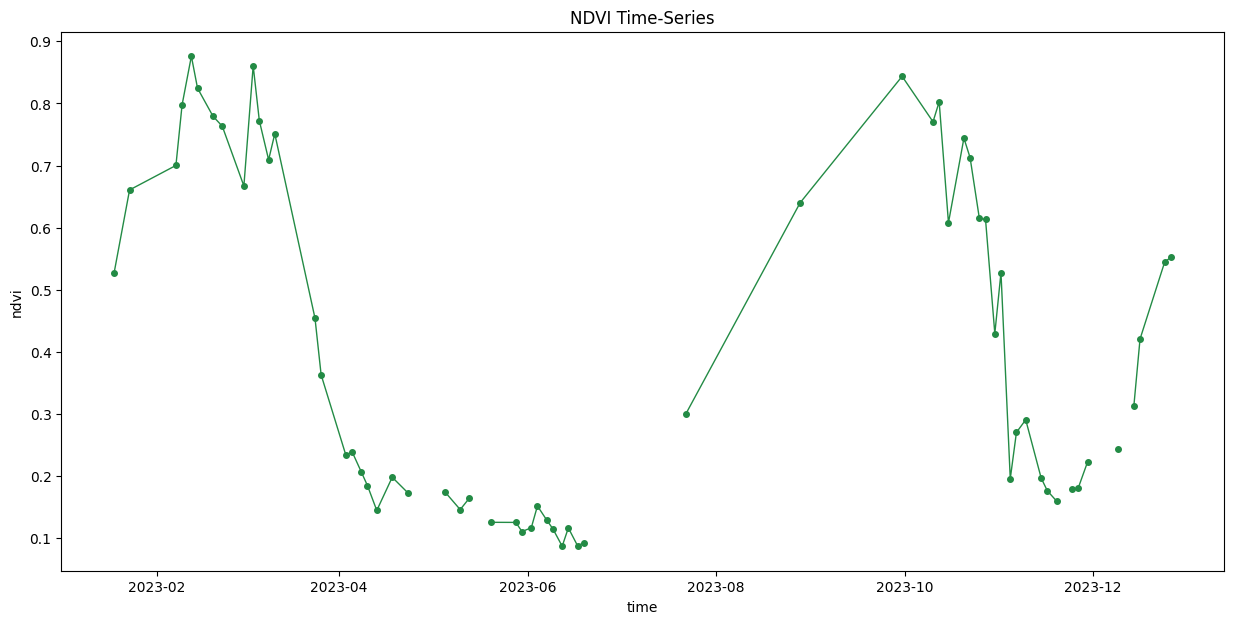 We have a data cube of multiple scenes collected through the year. As XArray supports vectorized operations, we can work with the entire DataSet the same way we would process a single scene.